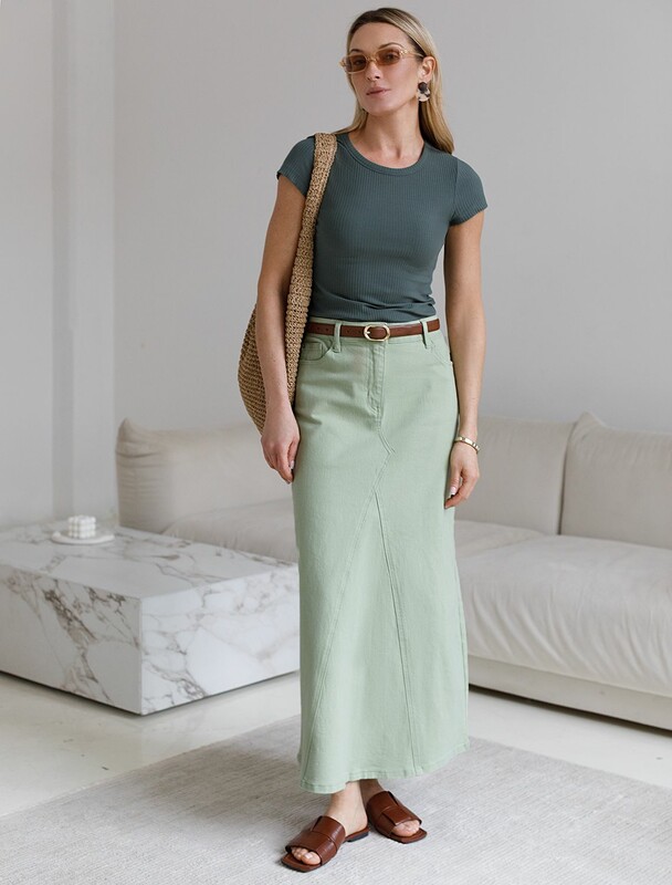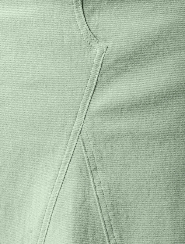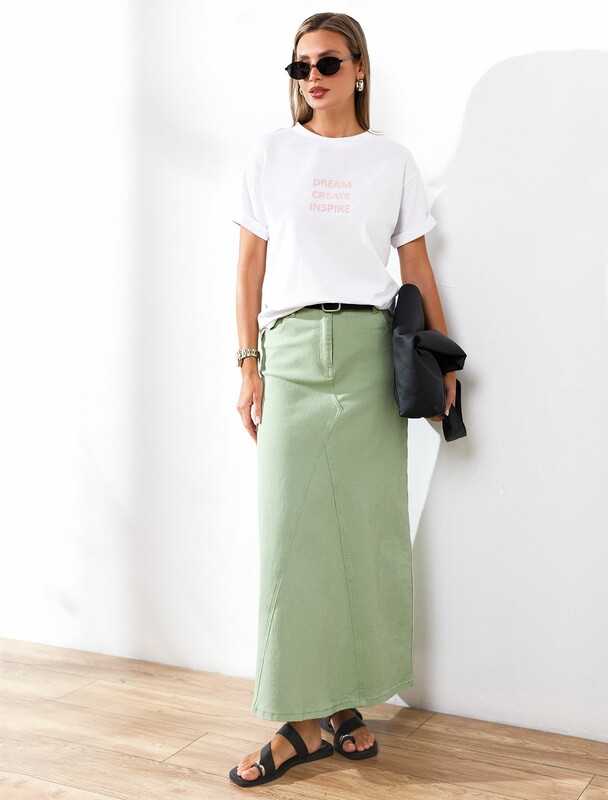 Юбка А-силуэта выполнена из денима с эластаном. Модель с посадкой на талии расширяется к низу за счет вставок из декоративных клиньев, расположенных спереди и сзади. Изделие дополнено пятью карманами как у джинс и брендированным патчем из эко-кожи. Сочетается в комплекте с курткой D51.033