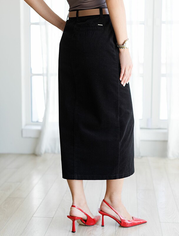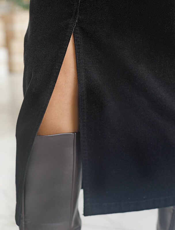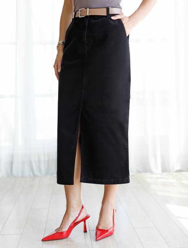 Юбка прямого кроя с выполнена из мягкого хлопкового микро-вельвета с добавлением эластана. Модель дополнена высоким разрезом спереди. Изделие комфортно садится по фигуре и не сковывает движения. Хорошо комбинируется с вязаным трикотажем, блузками и денимом. Также прекрасно станет альтернативой деловым низам в нестрогом офисном дресс-коде.