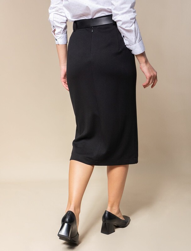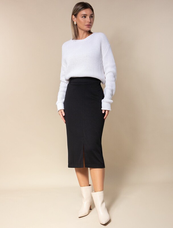 Юбка-карандаш выполнена из плотного джерси. Модель без подкладки дополнена разрезом спереди. Эластичный материал хорошо садится по фигуре обеспечивая абсолютный комфорт. Сзади застежка на потайную молнию. Выгодная инвестиция в базовый гардероб, подходит на все сезоны.