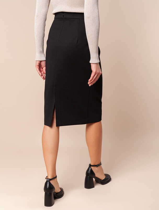 Юбка-карандаш выполнена из плотного джерси. Высокая посадка на талии. Сзади застежка на потайную молнию и шлица. Эластичный джерси почти не мнется, хорошо сохраняет форму и не оставляет заломов. Классический вариант для офиса или делового мероприятия.