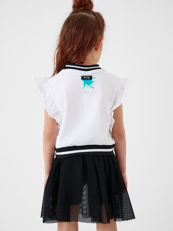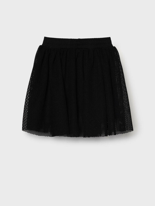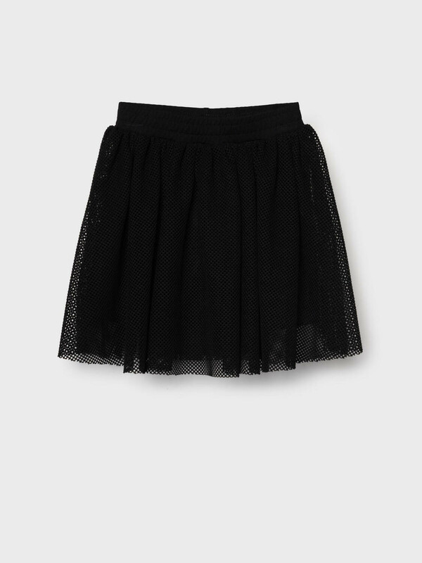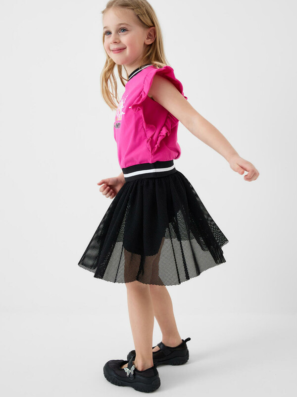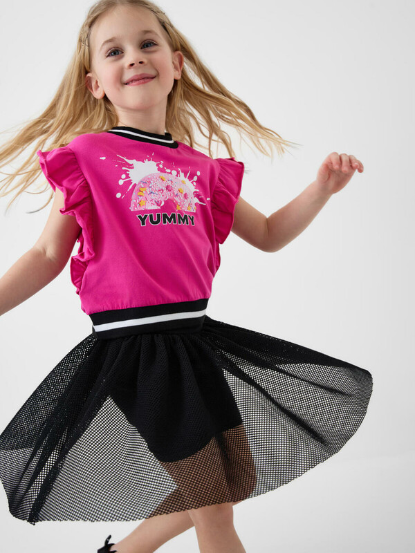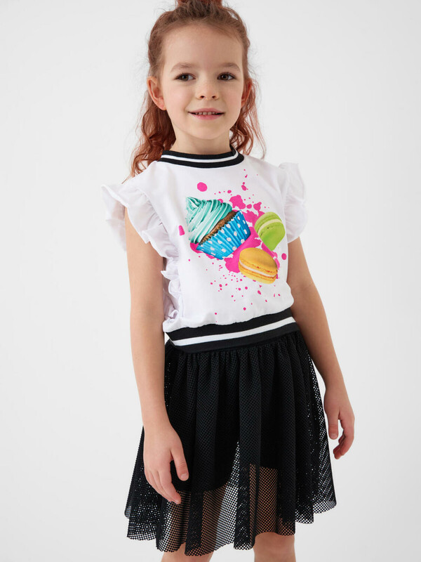 Детская юбка-леггинсы для девочки. Верхняя часть выполнена из легкой сетчатой ткани, под ней — плотные трикотажные укороченные леггинсы. Широкий пояс держится за счёт внутренней резинки. Длина юбки — до середины бедра.