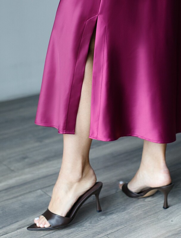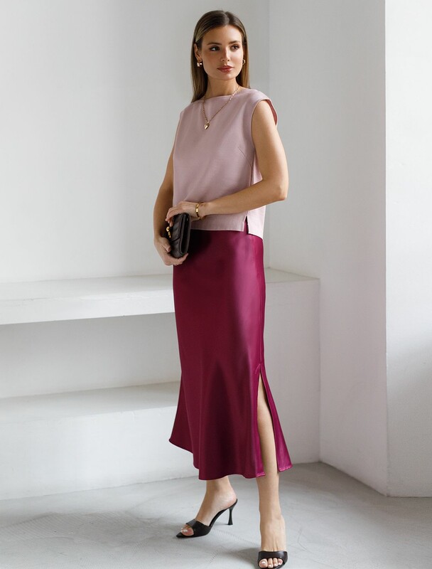 Главная страница - Каталог - Женская одежда оптом - Женская повседневная одежда - Женские юбки - Юбка миди с разрезом из струящегося плотного сатина