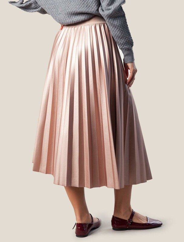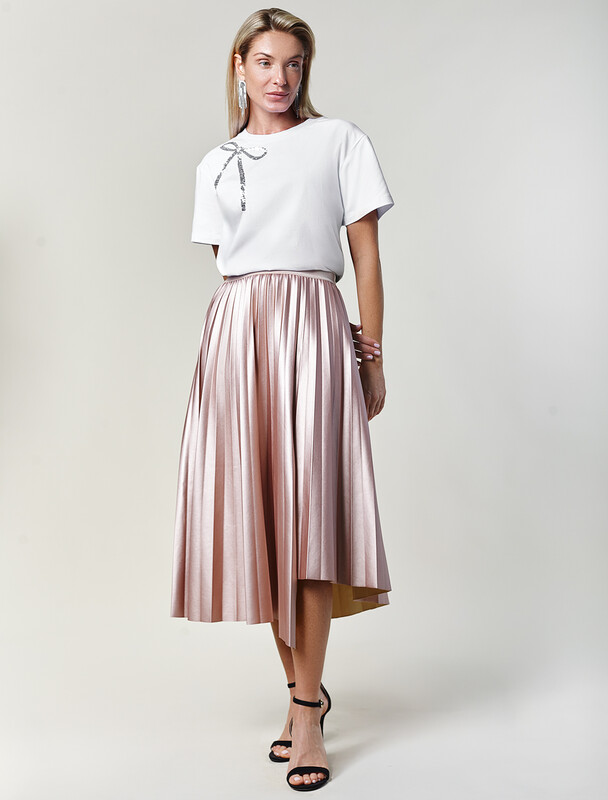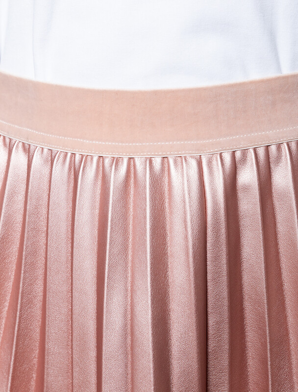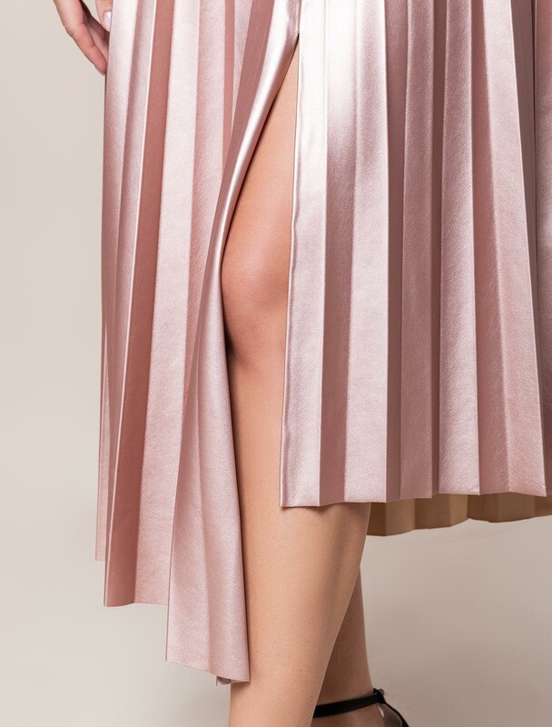 Асимметричная плиссированная юбка выполнена из мягкой эко-кожи. Посадка на талии акцентирована поясом из эластичной вельветовой ленты. Полуматовое покрытие смотрится утонченно и легко поможет создать вечерний образ, а также в повседневных образах станет отличным компаньоном к свитерам и высоким сапогам. На уровне ассиметричной линии спереди находится разрез, открывающий ноги. Атласное внутреннее покрытие обеспечивает идеальный комфорт при носке с колготками.