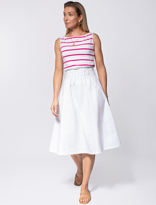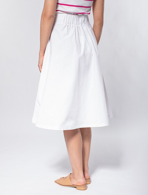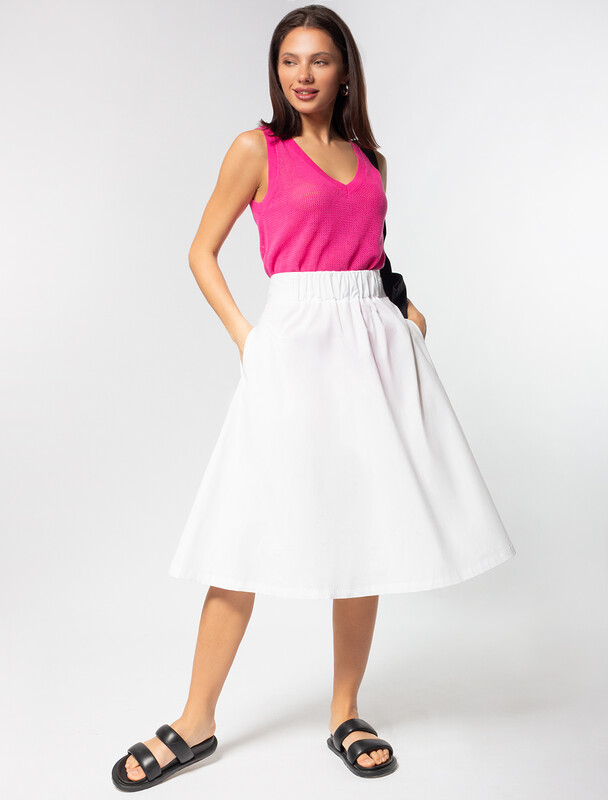 Юбка выполнена из плотного поплина. Удобный пояс на широкой резинке подчеркивает талию при этом не сковывая движений. Модель дополнена удобными карманами по бокам. Материал изделия прочный и износостойкий, но при этом мягкий и удобный, отлично держит форму и подходит для повседневной носки, гарантируя абсолютный комфорт даже в жаркое время года. Без подкладки
