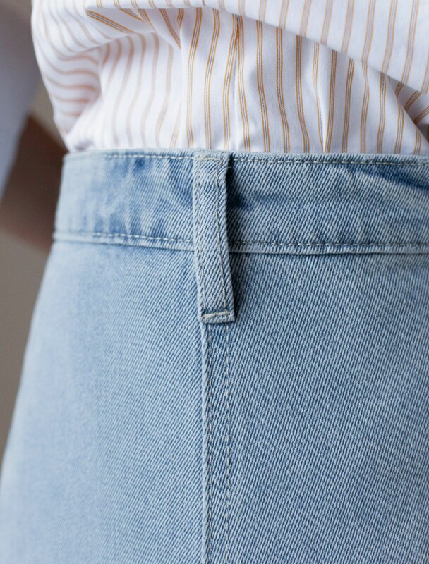 Юбка А-силуэта с застежкой на запАх выполнена из эластичного денима. Модель свободного кроя с посадкой на талии. Застежка на две пуговицы. Мягкий эластичный деним обеспечит комфорт и свободу движений. Хорошо сочетается с любым верхом и разной обувью.