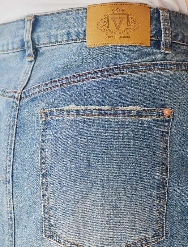 Юбка выполнена из эластичного денима. Модель с трендовой ассиметричной застежкой и декоративной стиркой дополнена краем с открытым срезом и потертостями. Изделие прямого кроя длиной чуть ниже колен с разрезом сзади дополнено брендированным патчем и высококачественной фурнитурой.