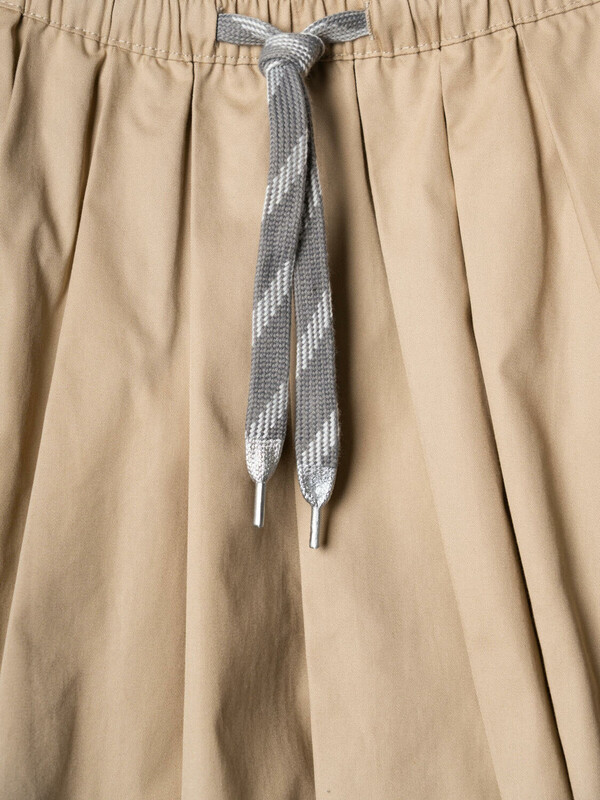 Мини-юбка для девочки подростка. Выполнена из легкой ткани и украшена складками по всей окружности. У модели эластичный пояс со шнуром для регулировки объема. Внизу юбка отделана контрастной белой полосой, придающей образу стильный вид.
