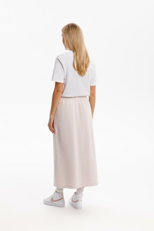 Юбка спортивного силуэта из мягкого двухцветного футера. Внутренняя сторона изделия представлена в натуральном цвете хлопка, внешняя в нежно-розовом. За счет использования крашенной пряжи, данный вид полотна прошел минимальную обработку, что придало изделию мягкость и шелковистость.