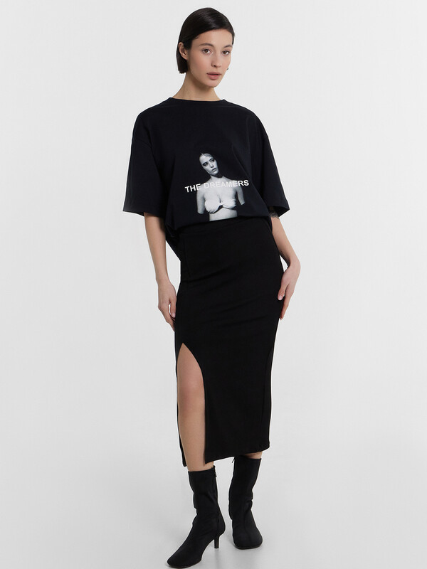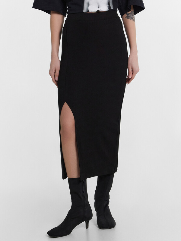 Юбка женская прилегающего силуэта из трикотажного полотна рибана. Юбка с отрезным поясом из основного полотна с эластичной тесьмой внутри. На детали переда шов с обработаным разрезом. Длина юбки ниже колена. Низ юбки сырой срез с проложеной строчкой по краю.
