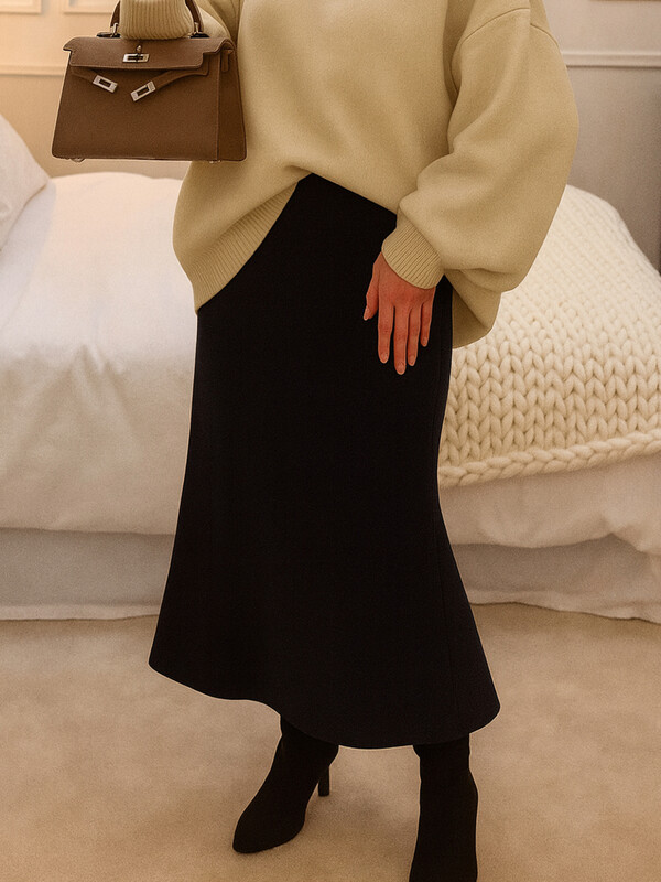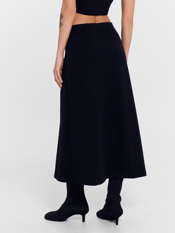 Юбка А-силуэта, длиной миди. Верхний срез обработан швом вподгбку с эластичной тесьмой (внутренняя). На задней детали застрочены вытачки. Нижний срез обработан швом вподгибку.