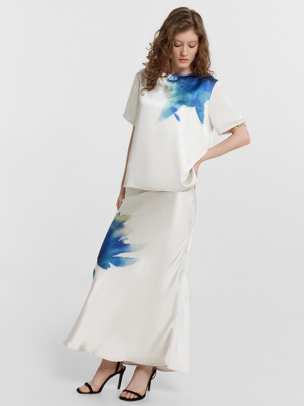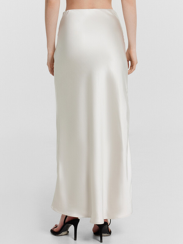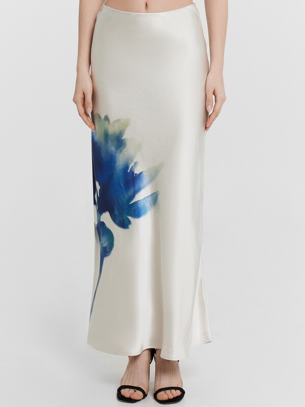 Юбка прямого силуэта, со средней посадкой длиной макси. Крой по косой. По верхнему срезу притачана эластичная тесьма (внутренняя 20мм 20RV), завернутая внутрь. Нижний срез обработан швом вподгибку с закрытым срезом.
