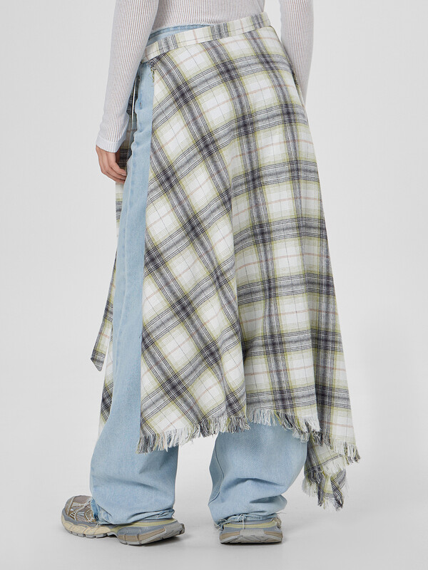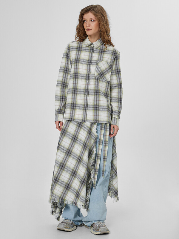 Женская юбка миди в бежево-серую клетку с эффектными необработанными краями. Модель с запахом крепится на регулируемые завязки, позволяя точно настроить посадку по фигуре. Отрезной пояс можно завязать разными способами — от строгого узла до свободного банта, создавая нужный силуэт.