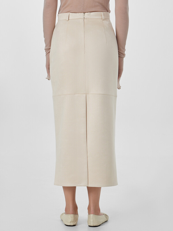 Отрезной пояс с петлями под ремень обеспечивает точную посадку по талии. Сзади расположена потайная молния для удобства надевания и аккуратного вида, а небольшой разрез добавляет свободы движению при ходьбе.