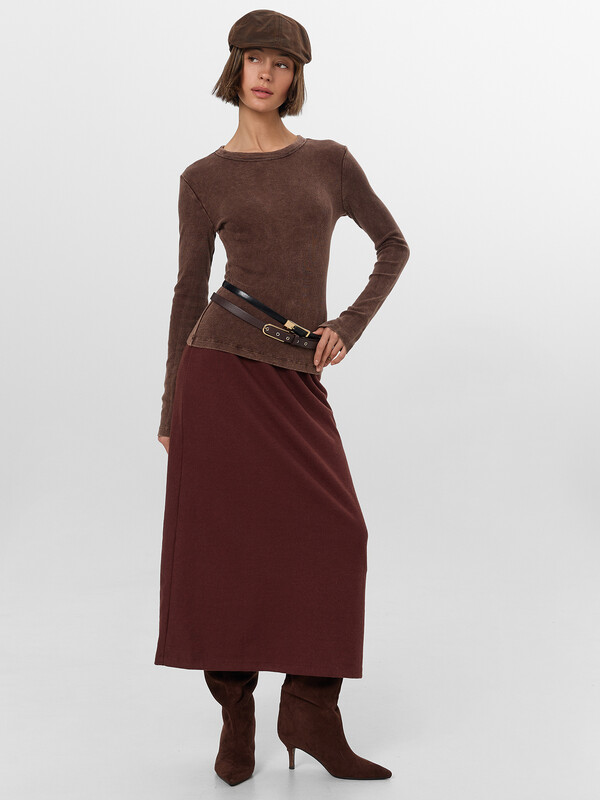 Женская юбка А-силуэта — элегантная простота для вашего повседневного гардероба. Плавно расширяющийся книзу силуэт мягко следует за линиями фигуры, создавая утонченный образ. Эластичный пояс бережно облегает талию, даря комфорт в течение всего дня.