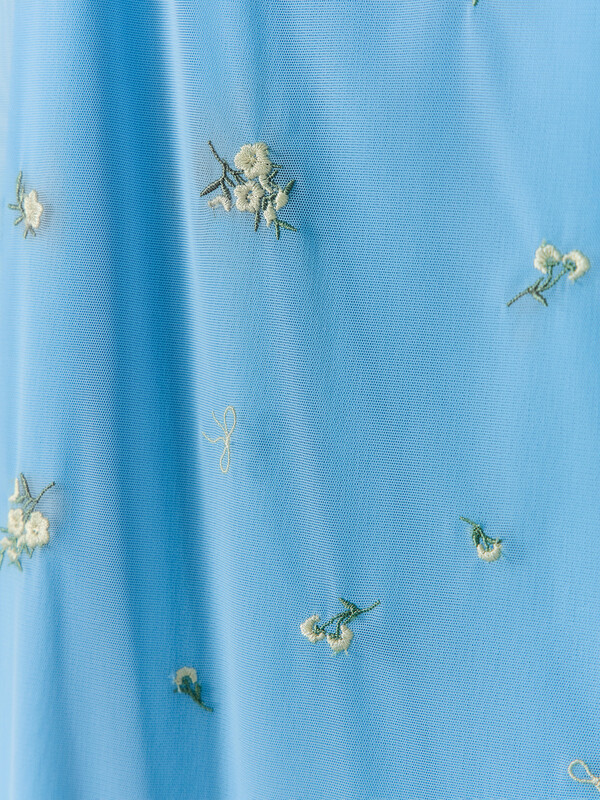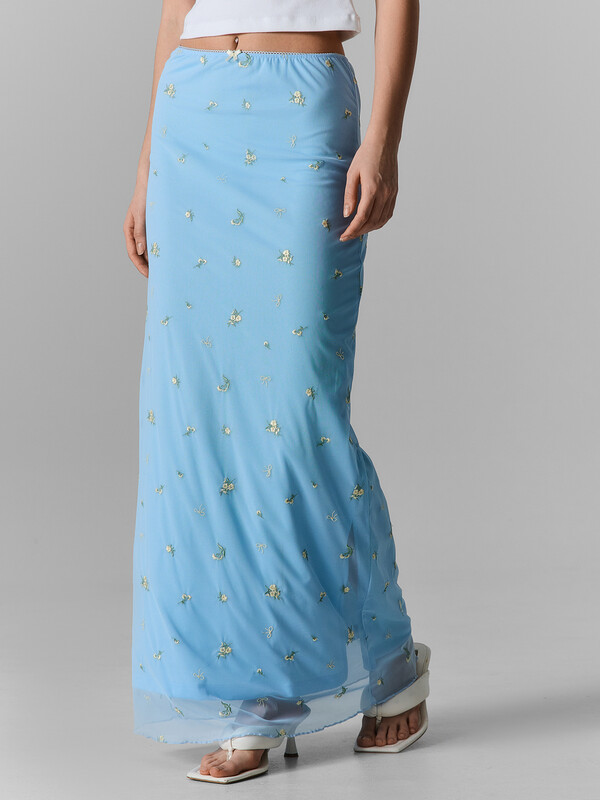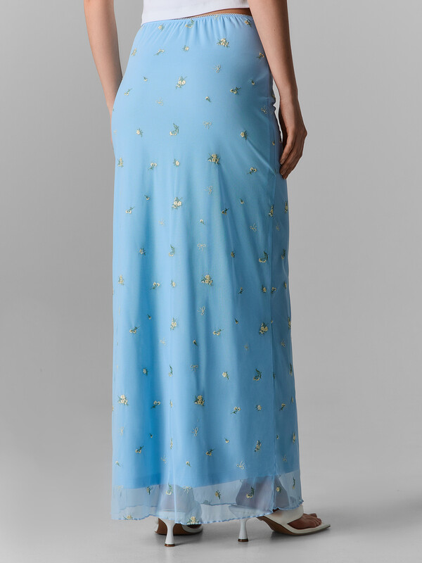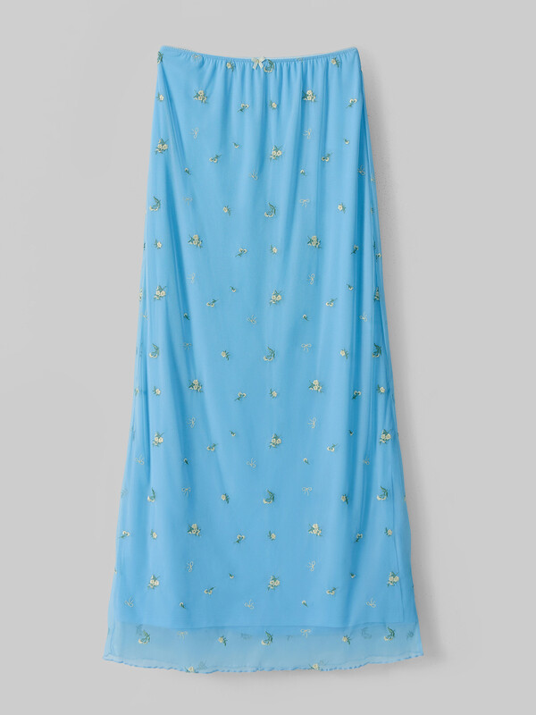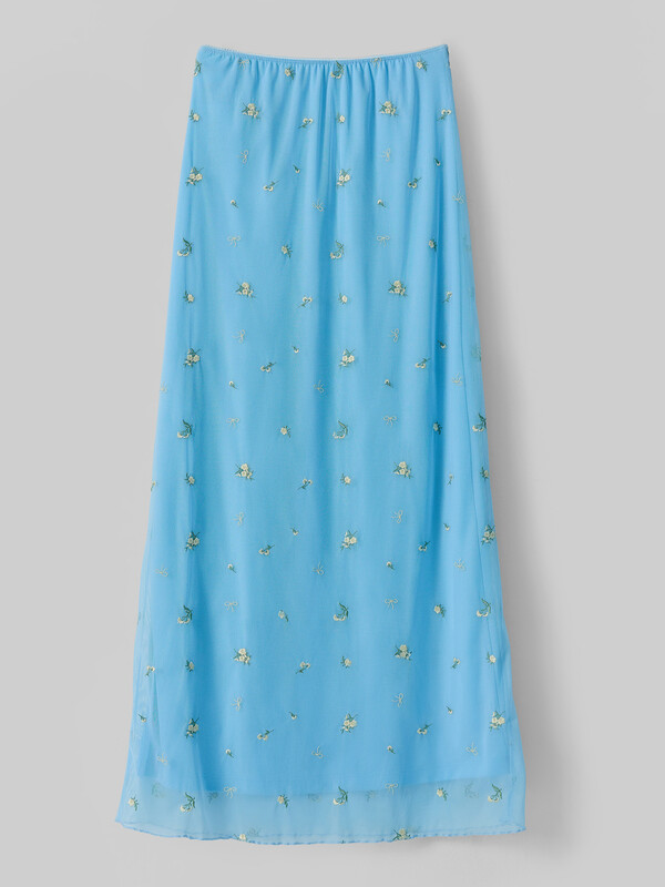 Юбка прямого силуэта. Пояс обработан эл тесьмой с зубом (KTE10-10 arteks, E2785P). Спереди по центру бантик 6737-0011А Ningbo. Подкладка из интерлока. Верхний слой юбки из сетки с вышивкой, низ юбки обработан на микрооверлоке. .