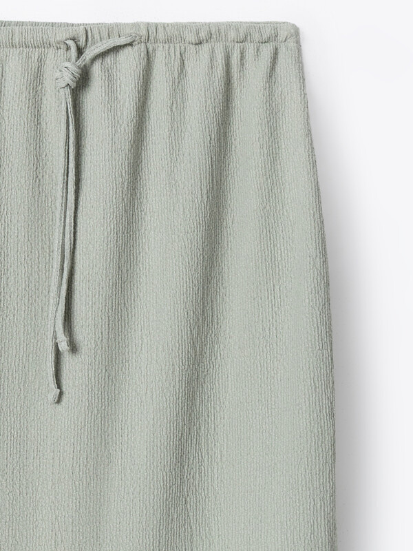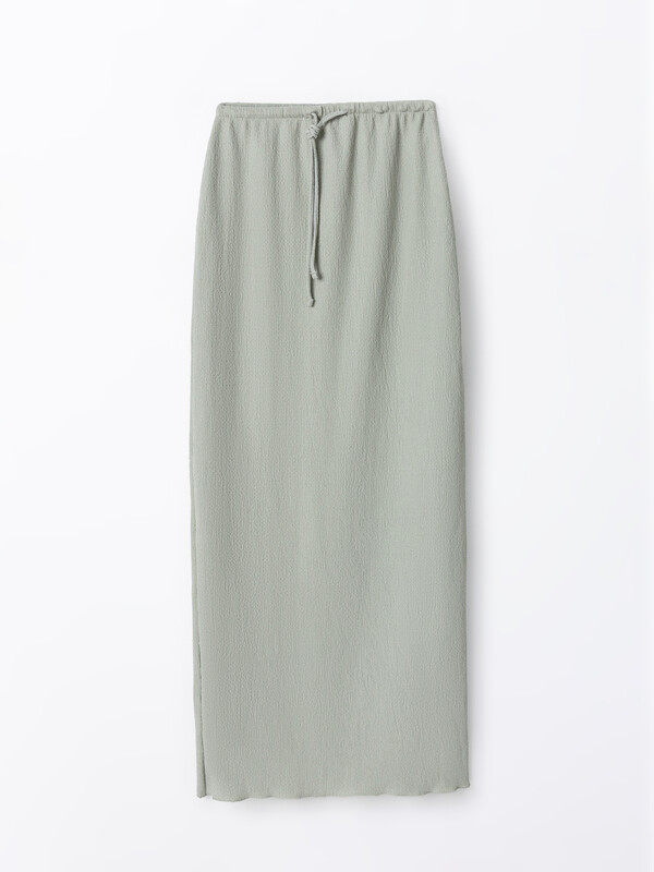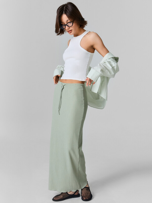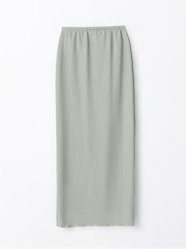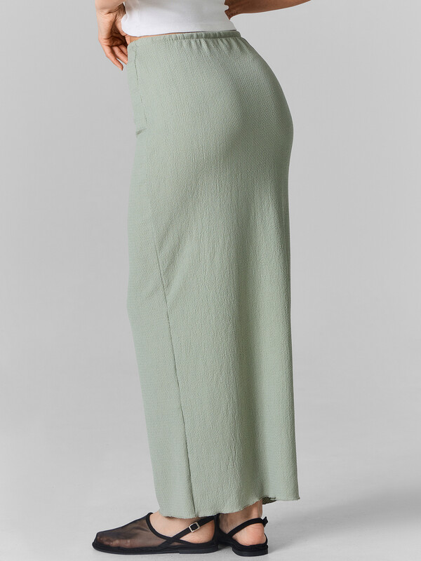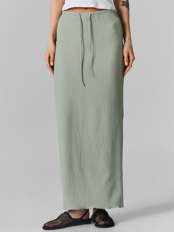 Юбка полуприлегающая, прямая. Пояс обработан вподгибку с тесьмой внутри из основного полотна и внутр резины 15RV. Низ обработан на микрооверлоке.
