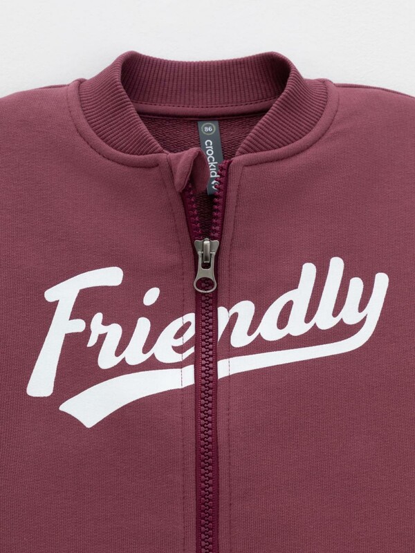 Бомбер для мальчика на молнии. Изготовлен из мягкого петельчатого трикотажа. В составе 80% натурального хлопка и 20% полиэстера, при этом полиэстер ввязан внутрь по особой технологии и не соприкасается с кожей. Воротник, манжеты и пояс выполнены из эластичного полотна. По бокам два кармана. Изделие сохраняет цвет и форму после многократных стирок. Все трикотажные полотна производятся в соответствии с нормами швейцарского сертификата ЭкоТекс.