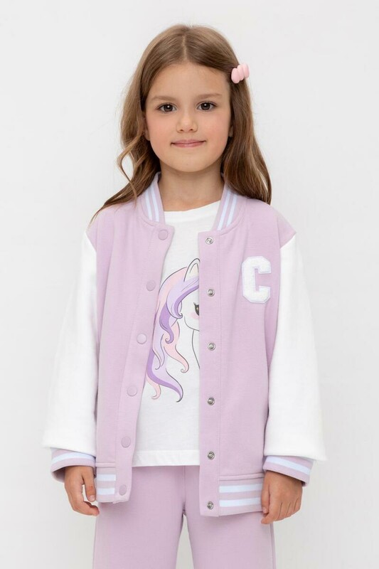Бомбер для девочки с контрастными рукавами из мягкого трикотажа. Воротник, манжеты и пояс - вязаные. Спереди карманы с листочкой.
