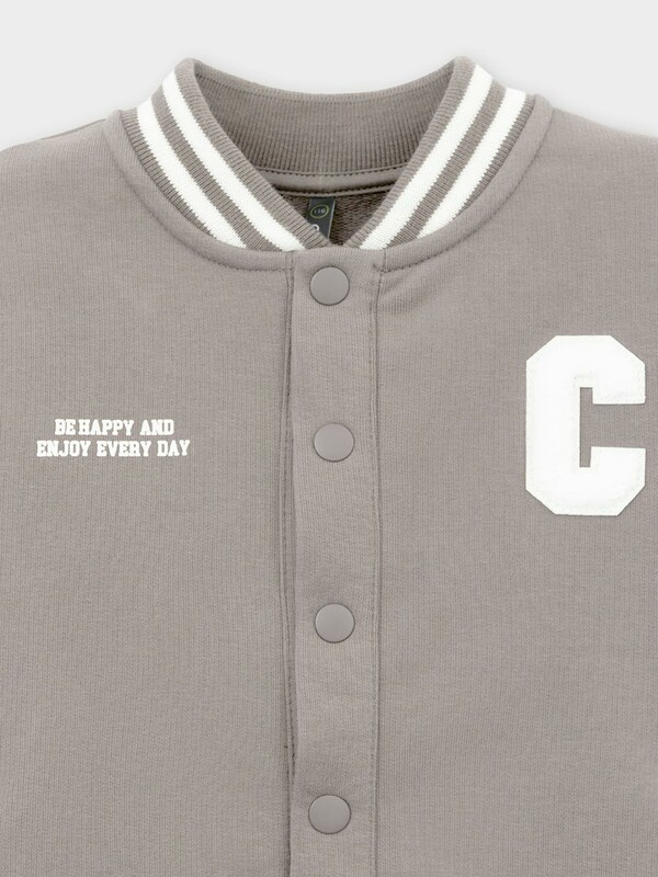 Бомбер с контрастными рукавами для мальчика. Изготовлен из мягкого петельчатого трикотажа. Застёгивается на кнопки. Воротник, манжеты и пояс - вязаные. Спереди карманы с листочкой.