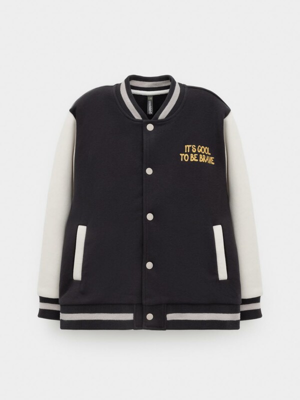 Бомбер для мальчика с контрастными рукавами из мягкого трикотажа. Застёгивается на кнопки. Воротник, манжеты и пояс вязаные. Спереди два кармана. Изделие сохраняет цвет и форму после многократных стирок. Все трикотажные полотна производятся в соответствии с нормами швейцарского сертификата ЭкоТекс.