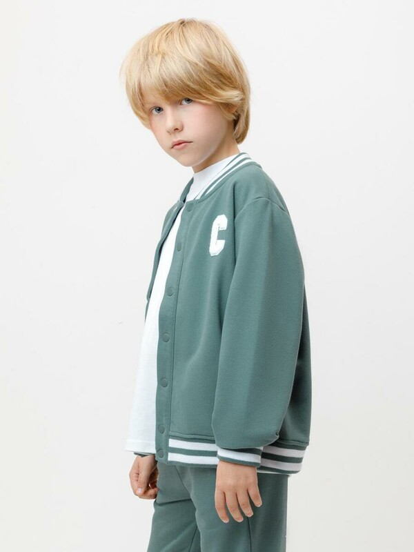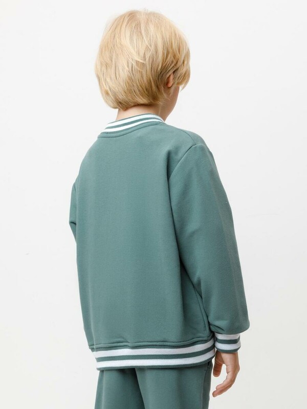 Бомбер с контрастными рукавами для мальчика. Изготовлен из мягкого петельчатого трикотажа. Застёгивается на кнопки. Воротник, манжеты и пояс - вязаные. Спереди карманы с листочкой.