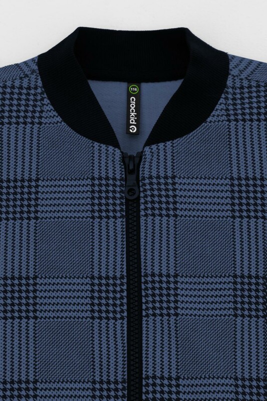 Бомбер для мальчика из мягкого трикотажа. Застёгивается на молнию. Воротник, манжеты и пояс -из эластичного трикотажа в рубчик. Спереди карманы с листочкой.