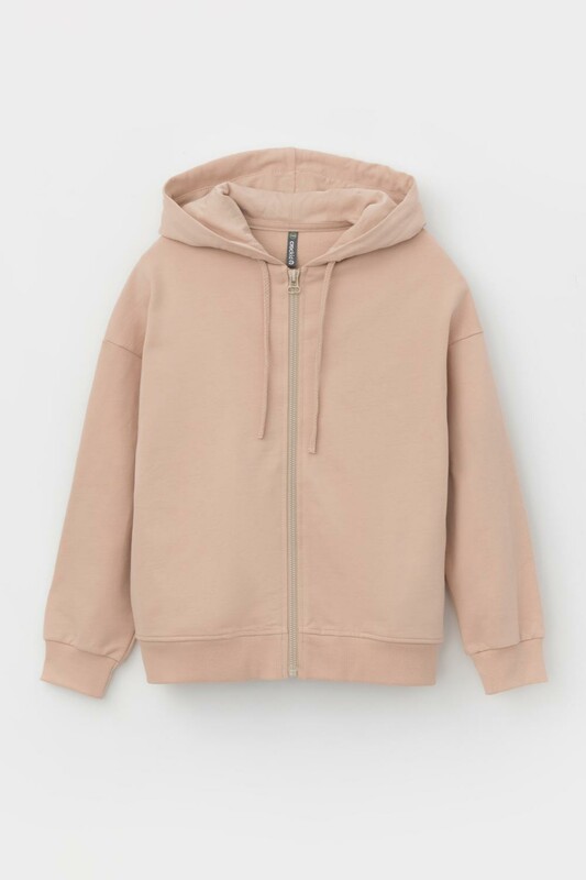 Трикотажная толстовка с капюшоном для девочки из петельчатого футера. Модель с карманами. Манжеты и пояс выполнены из эластичного трикотажа в рубчик.