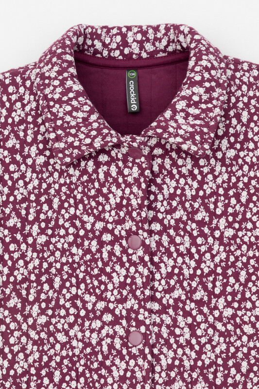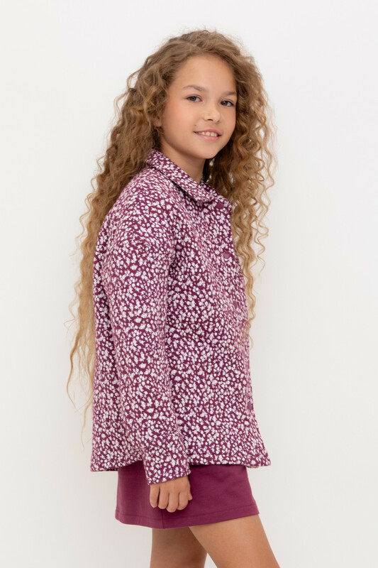 Свободная трикотажная рубашка для девочки из мягкого капитония на кнопках. Модель с закругленным низом и спущенным плечом. Оригинальная набивка выполнена из стойких текстильных гипоаллергенных красителей.