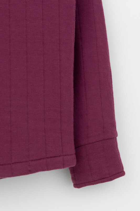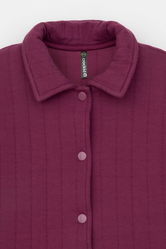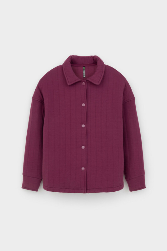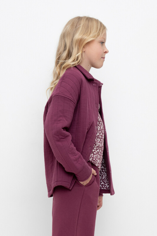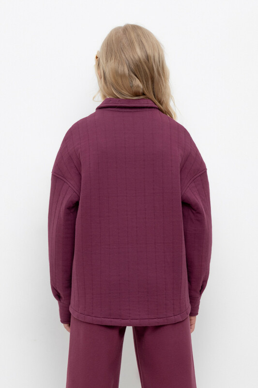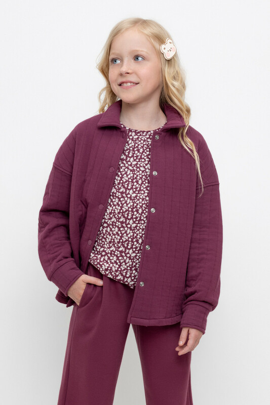 Свободная трикотажная рубашка для девочки из мягкого капитония на кнопках. Модель с закругленным низом и спущенным плечом.