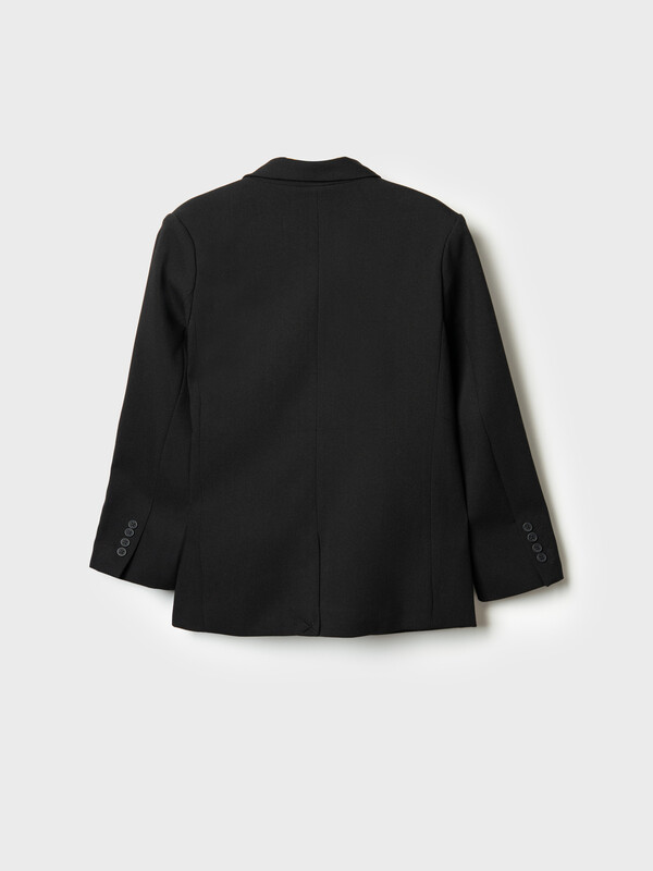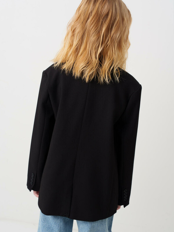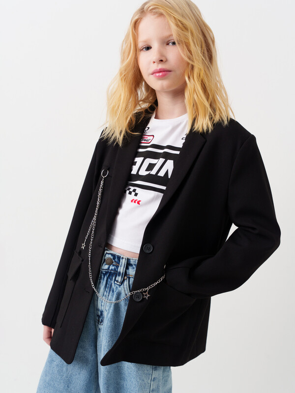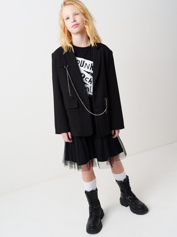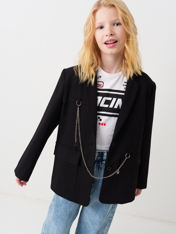 Пиджак для девочки подростка. Стильный черный жакет прямого силуэта. Застегивается на две пуговицы спереди и дополнен двумя большими карманами. Внутри — гладкая подкладка из таффеты. Главной особенностью дизайна служат декоративные элементы: металлическая цепочка с подвесками и необычные детали в зоне груди — фальш-карман и значок.