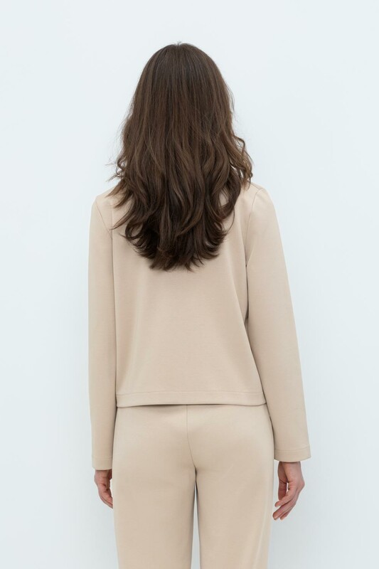 Женский укороченный жакет прямого кроя с имитацией карманов с клапаном из плотного набивного гладкого трикотажа интерлок. Гладкий и плотный материал на основе хлопка сохраняет форму.