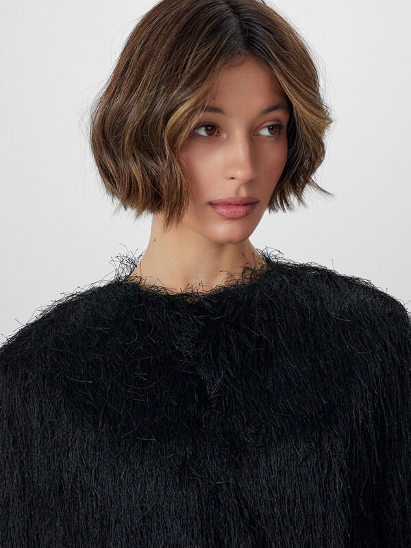 Пушистый жакет из лимитированной коллекции Mark Formelle x Ольга Бузова — тот самый акцент, который сделает ваш праздничный образ завершенным. Укороченный крой, роскошная бахрома и декоративный край придают ему особый шарм и индивидуальность.