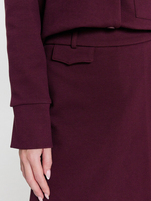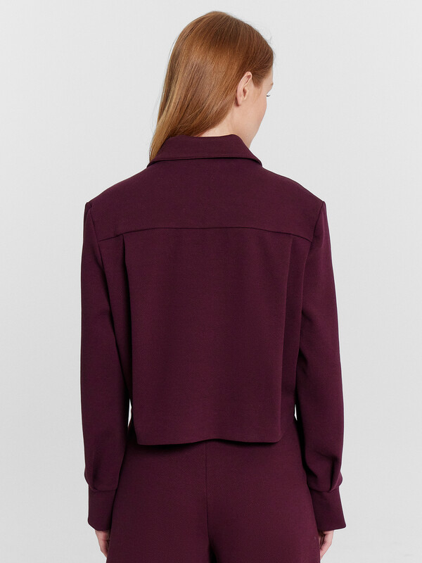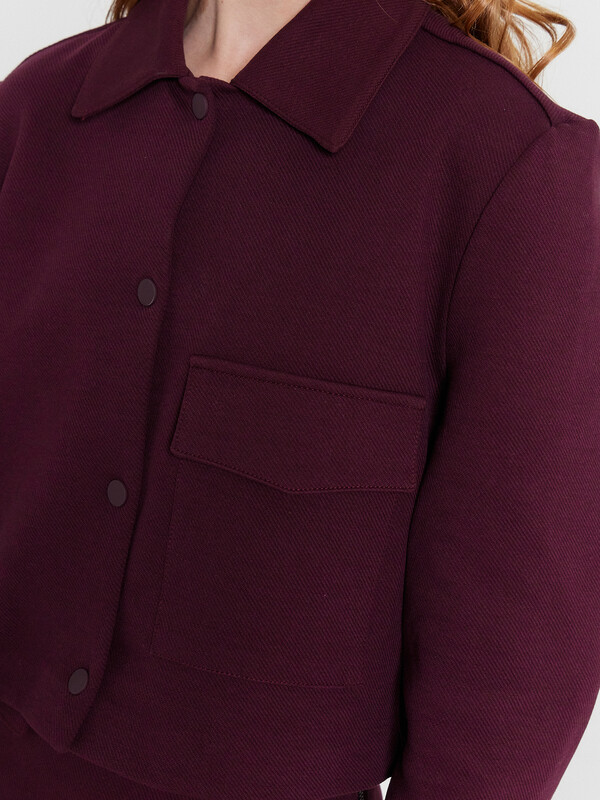 Жакет женский прямого силуэта, укороченый. Горловина круглой формы с втачным стояче-отложным воротником. Перед с центральной застежкой на кнопки. На левой передней детали накладной карман с клапаном. Рукав втачной, длинный. По низу рукава отрезная манжета из основного полотна и заложена складка. Спинка с отрезной кокеткой, на спинке заложены две складки. Нижний срез жакета обработан швом вподгибку.