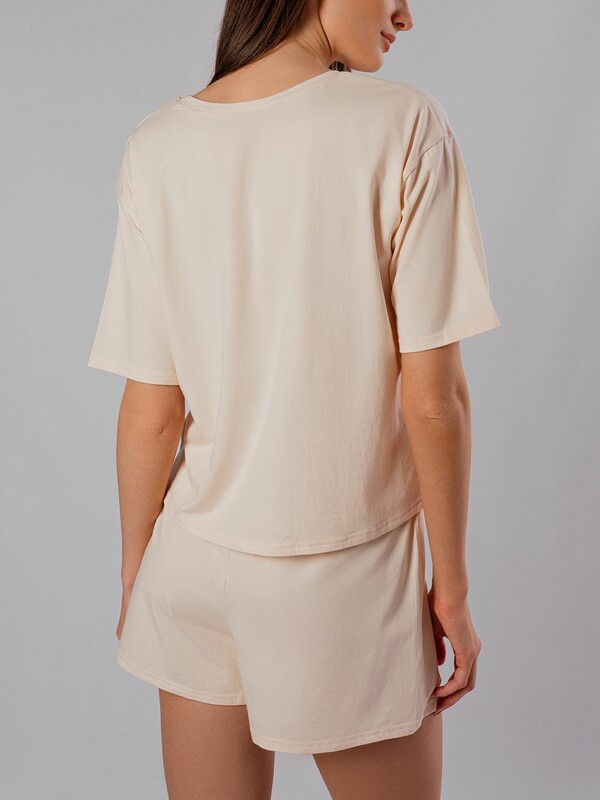 Пижама состоит из футболки свободного кроя с короткими рукавами и округлым вырезом.