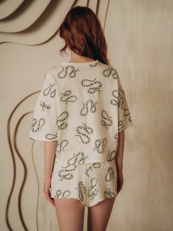 Пижама украшена анималистичным принтом с изображением змей, на футболку спереди нанесена надпись «Medusa».