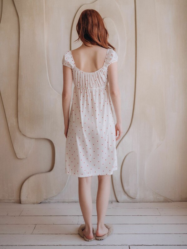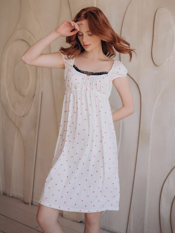 Сорочка выполнена в белом цвете с нанесённым принтом с изображением сердечек.
