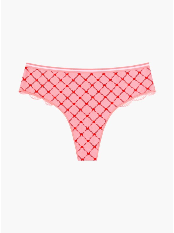 Женские трусы-стринги из хлопка в ярком розовом цвете с красным принтом и с кружевными узорами от торговой марки Indefini - это отличный выбор для любой женщины.