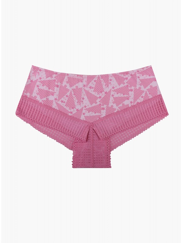 Украшением трусов танга Indefini является розовое кружевное обрамление и геометрический принт с изображением контуров ёлочек и звёздочек.