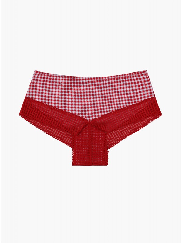 Принт в красно-белую клетку добавляет образу игривую нотку, а элегантное кружевное обрамление придаёт трусам женственность и утонченность.