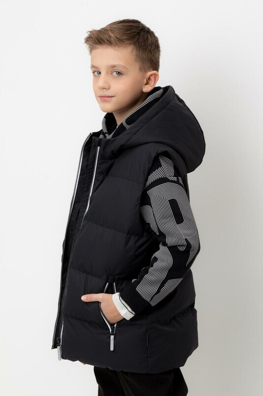 Стеганый жилет с капюшоном для мальчика с утеплителем Fellex®: 120 г/м2. Выполнен из мембранной ткани с дополнительной тефлоновой обработкой. Данный вид обработки предохраняет изделие от загрязнения и лучше отводит влагу. Подклад из 100% полиэстра. Капюшон не снимается. Изделие застёгивается на молнию, предусмотрена защита подбородка. Два кармана по бокам застёгиваются на молнии. Во всех изделиях верхнего ассортимента для безопасности ребенка предусмотрены светоотражающие элементы.