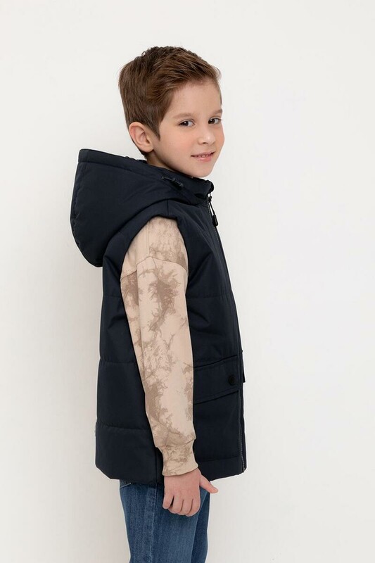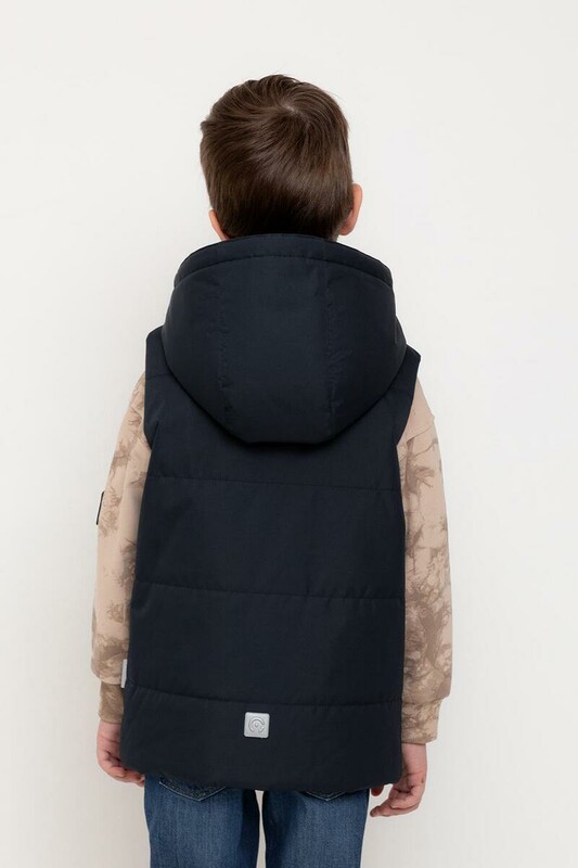 Стеганый жилет с капюшоном для мальчика с утеплителем Fellex®: 120 г/м2. Выполнен из мембранной ткани с дополнительной тефлоновой обработкой. Данный вид обработки предохраняет изделие от загрязнения и лучше отводит влагу. Подклад из 100% полиэстра. У изделия предусмотрена защита подбородка. Капюшон утягивается при помощи эластичного шнура со стопперами. Накладные карманы с клапанами на кнопках. Во всех изделиях верхнего ассортимента для безопасности ребенка предусмотрены светоотражающие элементы.