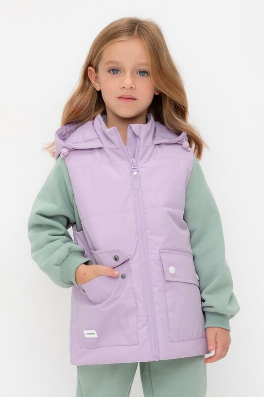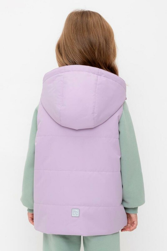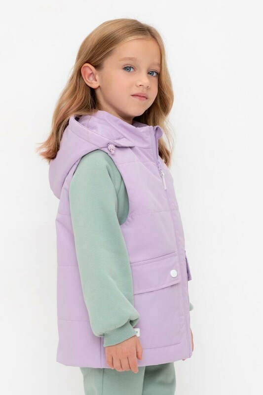 Стеганый жилет с капюшоном для девочки с утеплителем Fellex®: 120 г/м2. Выполнен из мембранной ткани с дополнительной тефлоновой обработкой. Данный вид обработки предохраняет изделие от загрязнения и лучше отводит влагу. Подклад из 100% полиэстра. У изделия предусмотрена защита подбородка. Капюшон утягивается при помощи эластичного шнура со стопперами. Накладные карманы с клапанами на кнопках. Во всех изделиях верхнего ассортимента для безопасности ребенка предусмотрены светоотражающие элементы.