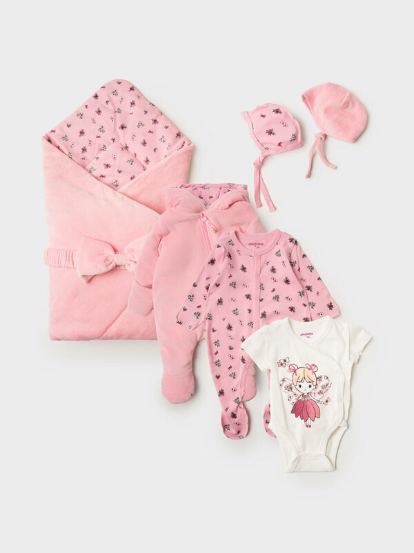 Комплект детский трикотажный для девочек: конверт-одеяло, комбинезон – 2 шт, боди, чепчик, шапочка