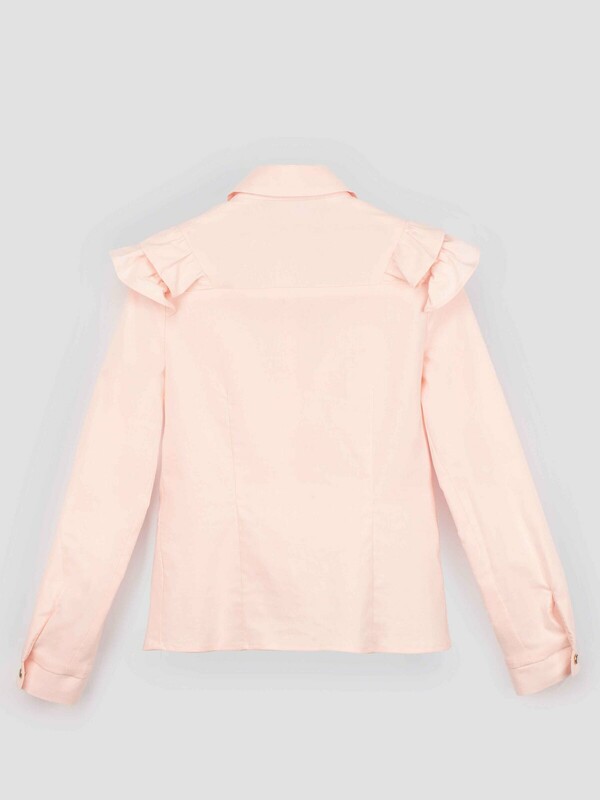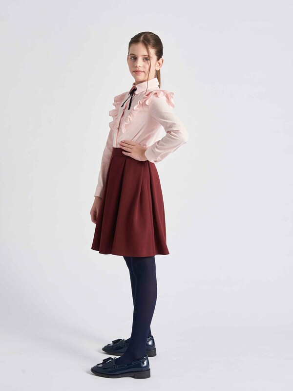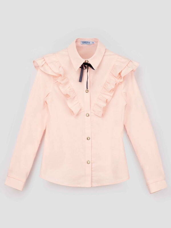 Эффектная блузка для девочки из смесового хлопка полуприлегающего силуэта с отложным воротником и длинными рукавами. Высокое содержание хлопка в составе обеспечивает отличную воздухопроницаемость и комфорт в повседневной носке. Полочка блузки и рукава декорированы оборками из основной ткани. Воротник дополнен небольшим бантом контрастного цвета из бархатной ленты. Центральная застёжка на планку с пуговицами, отличный вариант на каждый день.