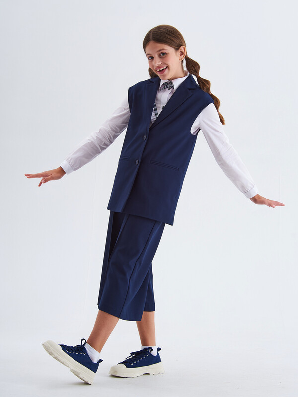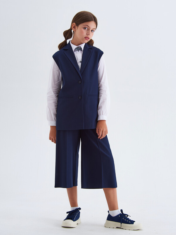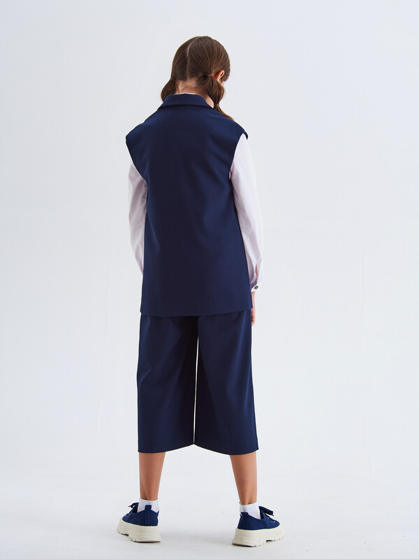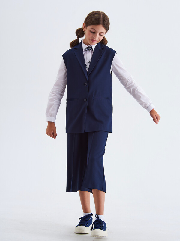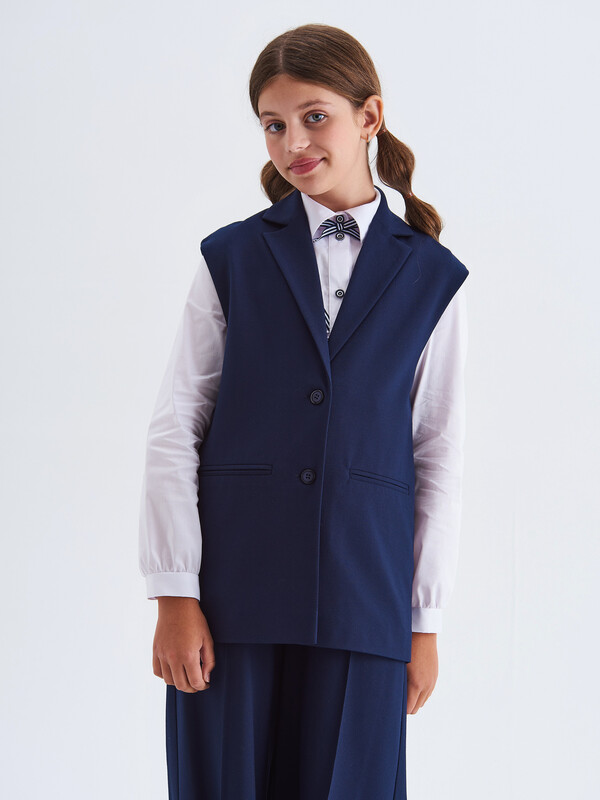 Стильный удлиненный жилет с воротником для девочки на подкладке, из поливискозы синего цвета. Полочки дополнены имитацией прорезных карманов. Жилет застегивается на пуговицы.Жилет будет прекрасным дополнением к моделям из школьной коллекций SMENA, отличный вариант на каждый день.