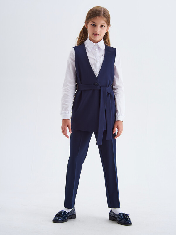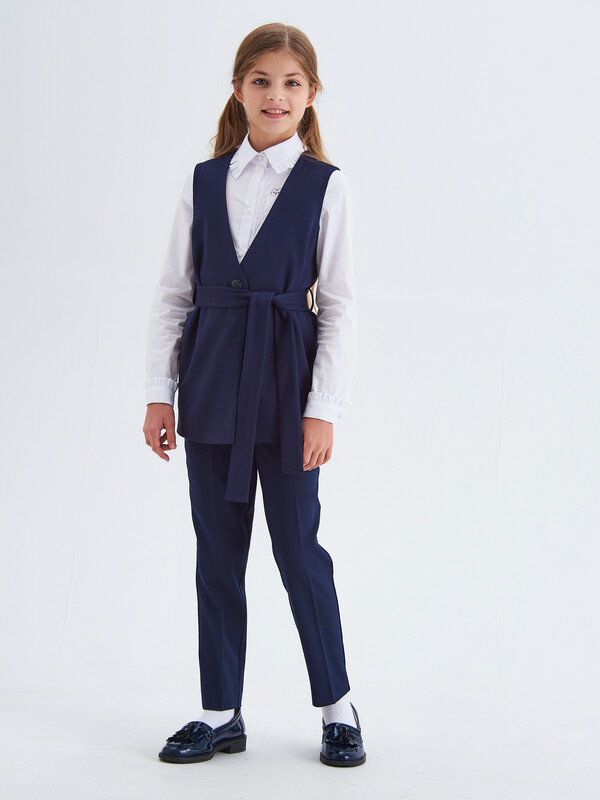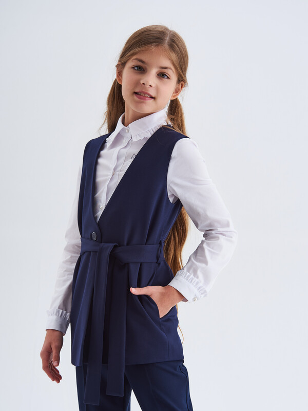 Удлиненный трикотажный жилет для девочки на подкладке с V образным вырезом. Жилет застегивается на пуговицу и пояс. В боковых швах расположены карманы.
