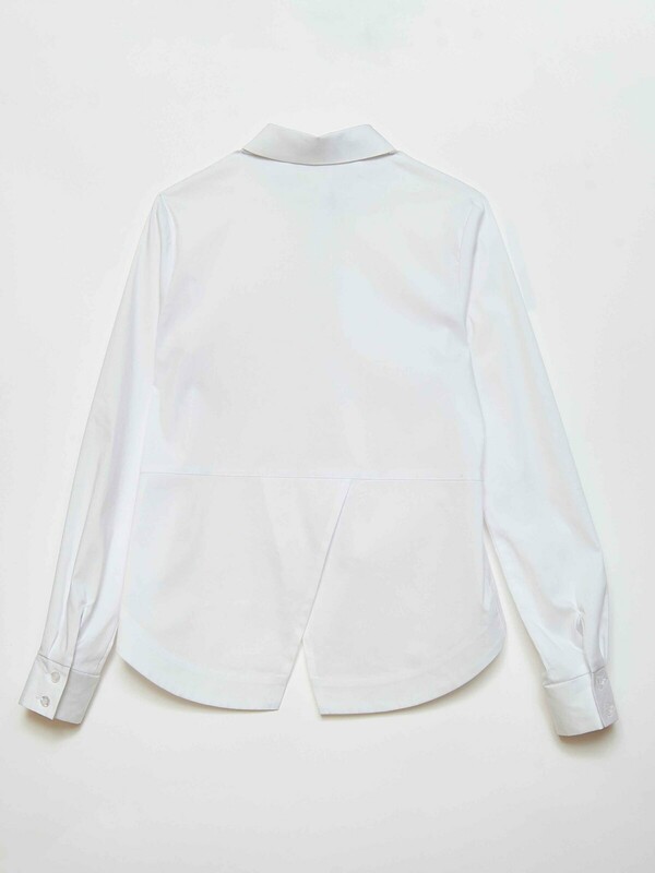 Свободная блузка для подростков из смесового хлопка с отложным воротником со стойкой и длинными рукавами на манжете. Передняя часть укороченная. На полочке расположены два накладных кармана. Спинка удлинённая с фигурным низом и запахом из под линии кокетки. Застежка на планку с пуговицами. Высокое содержание хлопка в составе обеспечивает отличную воздухопроницаемость и комфорт в повседневной носке. Блузка будет прекрасным дополнением к моделям из школьной коллекции SMENA, отличный вариант на каждый день.