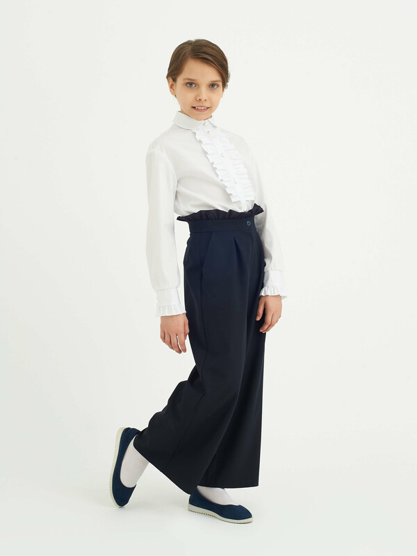 Классическая блузка из смесового хлопка полуприлегающего силуэта с отложным воротником. Длинные спущенные рукава с манжетами, по краю манжет выполнена декоративная оборка. Полочка декорирована оборками по центральной застёжке с пуговицами Высокое содержание хлопка в составе обеспечивает отличную воздухопроницаемость и комфорт в повседневной носке.