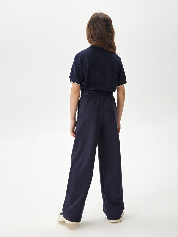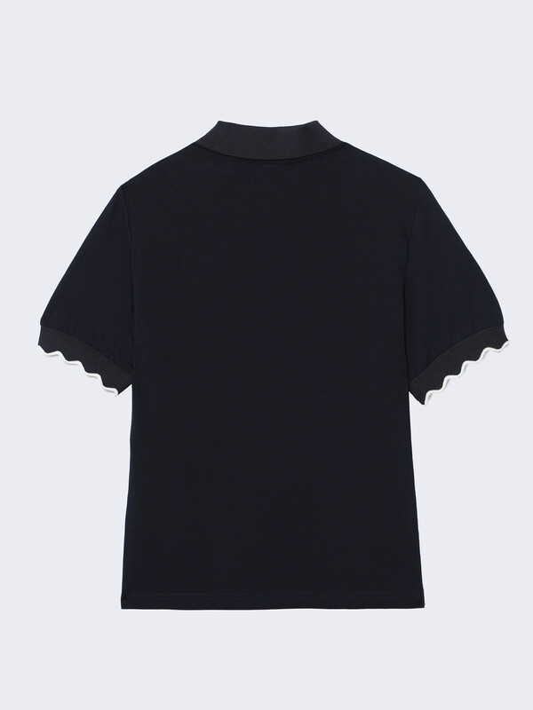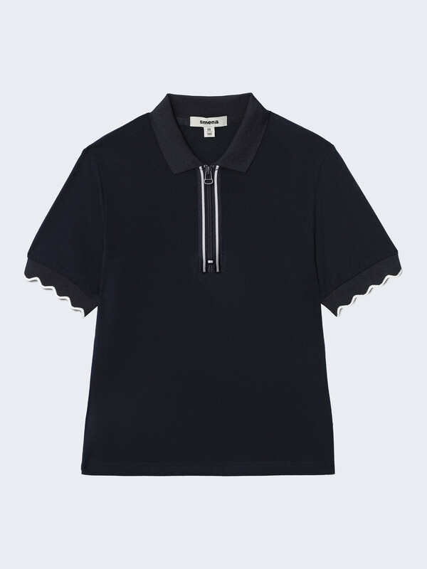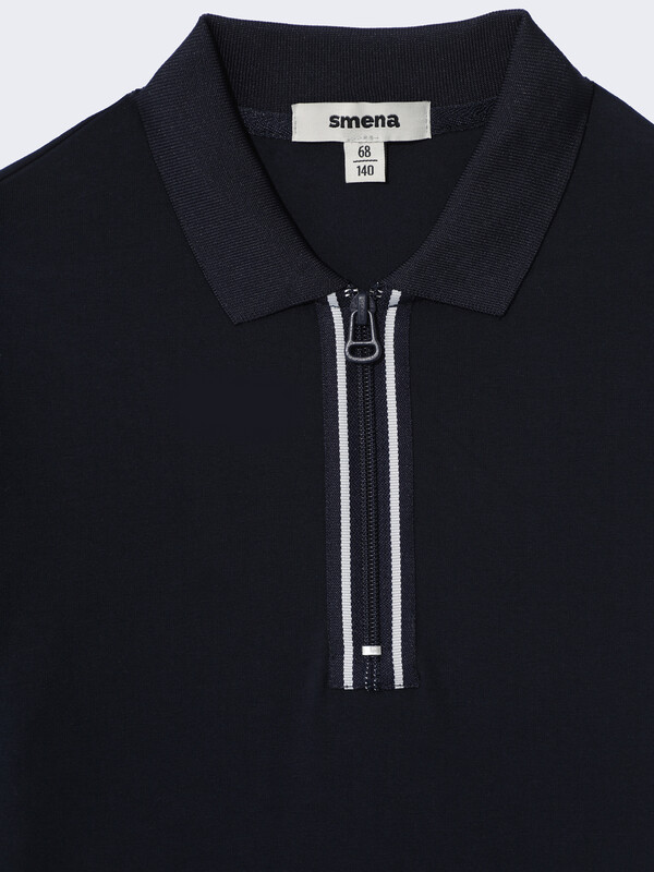 Трикотажное поло для девочки полуприлегающего силуэта с короткими рукавами. Край рукава с манжетами на подвязе и фактурным краем. Воротник отложной со стойкой . Укороченная застёжка на переде на молнию обеспечивает идеальную посадку.