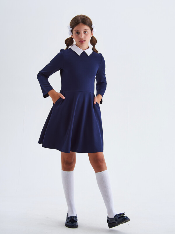 Трикотажное платье А-образного силуэта с длинными рукавами, отрезное по линии талии. Платье дополнено съемным отложным воротником контрастного белого цвета, что обеспечивает не только удобство в уходе, но и возможность разнообразить ежедневный образ. На переднем полотнище юбки расположены боковые карманы. Застежка на потайную молнию на спинке не нарушает конструкцию и обеспечивает идеальную посадку.